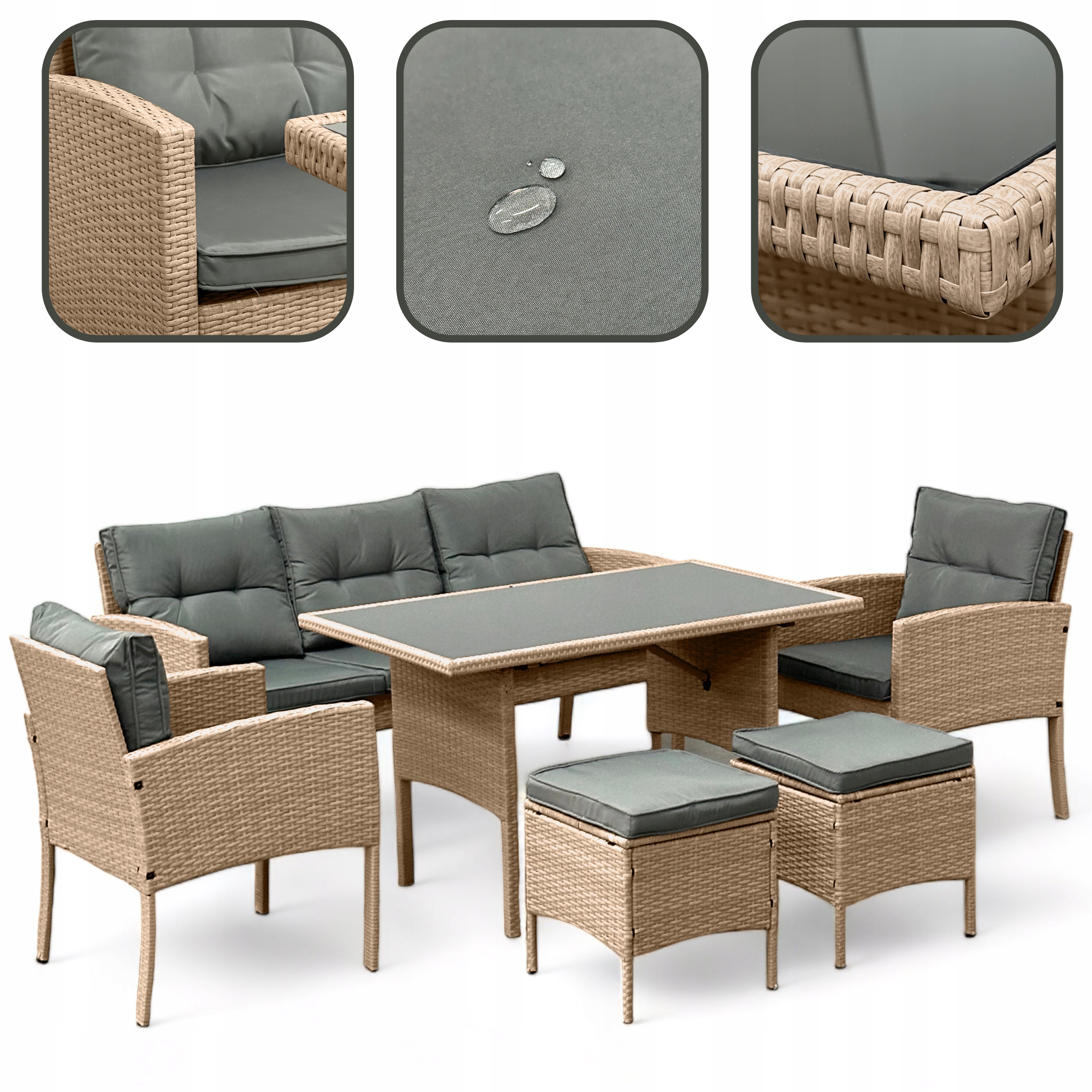 Luksusowy Komplet Obiadowy Premium – Sofa, 4 Fotele, 2 Pufy i Stół Jadalniany NEUTRALNY – Poduszki szare