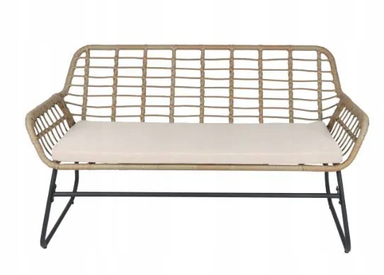 RAMA: stalowy stelaż, czarny PODUSZKA: beżowa 5cm, polyester siedziska plecione z PE ratan STÓŁ: 5mm szkło hartowane, przezroczyste 2*KRZESŁO:63x67x75cm, 1*ŁAWKA:132x67x75cm, 1*STÓŁ:90x45x40cm